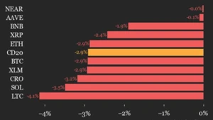CoinDesk 20 performance update: index falls 2.9% as all constituents trade lower