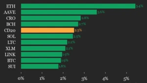 Actualización del rendimiento de CoinDesk 20: el precio de Ethereum (ETH) aumenta un 5.4%