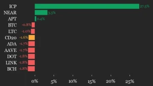 CoinDesk 20 Performance Update: Internet Computer (ICP) Leaps 27.5% as Index Falls