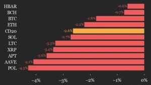 The CoinDesk 20 index fell 2.6%, with all 20 assets declining, led by Uniswap's 7% drop.
