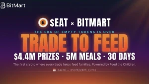 To celebrate its eighth anniversary, the BitMart exchange has launched the "Trade-to-Feed" competition, running from April 28 to May 28, 2026. The event features a total prize pool of up to $4.4 million USDT, distributed through volume leaderboards, power drops, and lucky draws. This initiative marks the debut of "cause coins" on the platform, specifically the $EAT (WYDE: End Hunger) token, designed to direct trading fees toward charitable hunger-relief organizations like Feed the Children and community-voted local food banks.